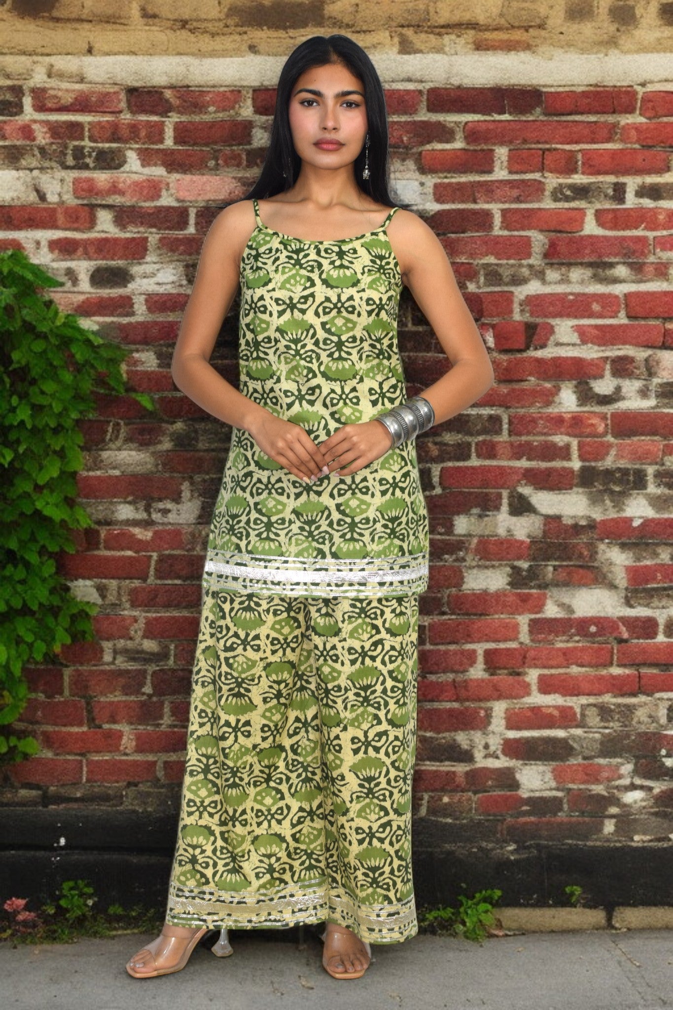 The Aaranya Co-ord Set is a celebration of effortless elegance and handcrafted detail. Made in soft, breathable cotton, this two-piece set features a delicately printed spaghetti-strap top paired with relaxed, wide-leg pants. The all-over indigo block-inspired motifs are finished with subtle border detailing, adding a refined artisanal touch.