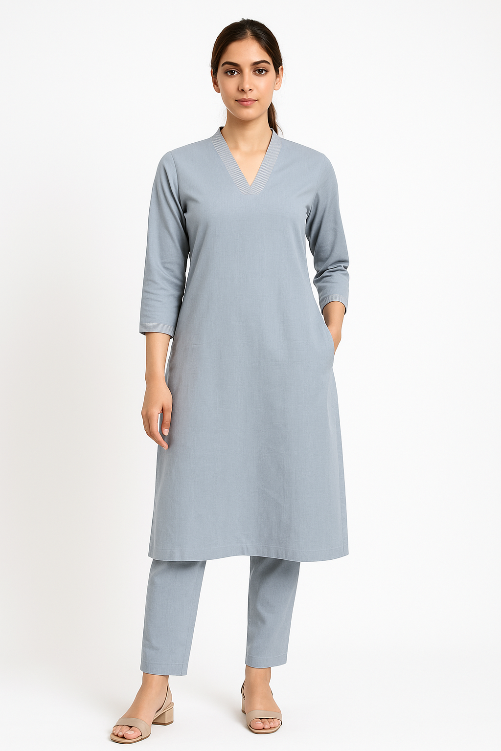 Refresh your everyday style with this soothing grey coord set, designed for effortless elegance and all-day comfort. The set features a straight-cut kurta with a subtle V-neck and 3/4th sleeves, paired with matching tapered pants for a clean, refined silhouette. Made from soft, breathable fabric, this coord set delivers a perfect blend of simplicity and sophistication.