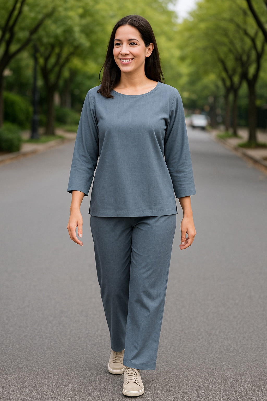 The relaxed-fit top with a soothing round neckline and three-quarter sleeves offers ease without distraction, while the straight-fit pants provide stability and comfort for yoga, meditation, and mindful living. Its minimal design and serene colour make it ideal for both studio practice and post-session relaxation.