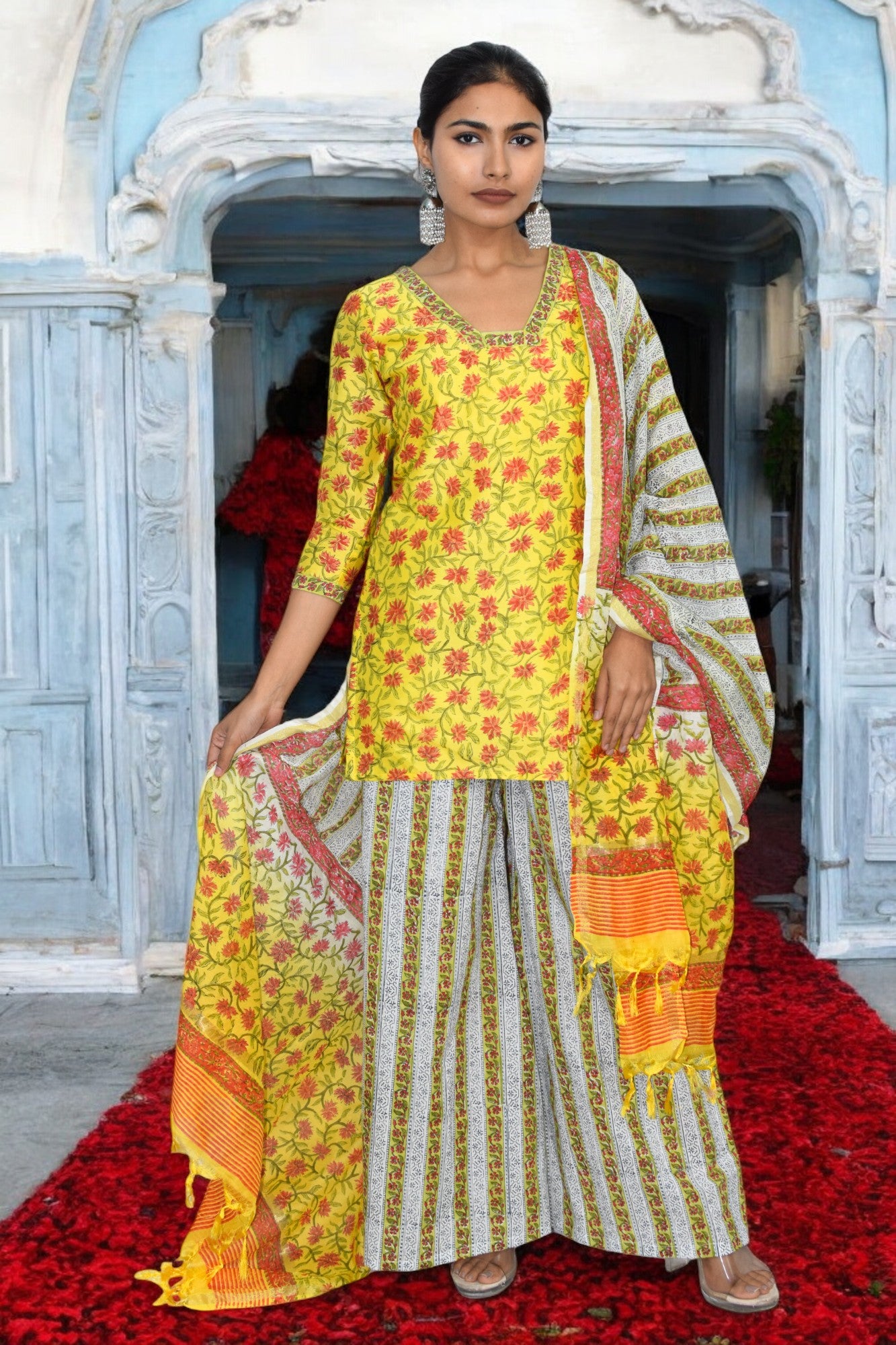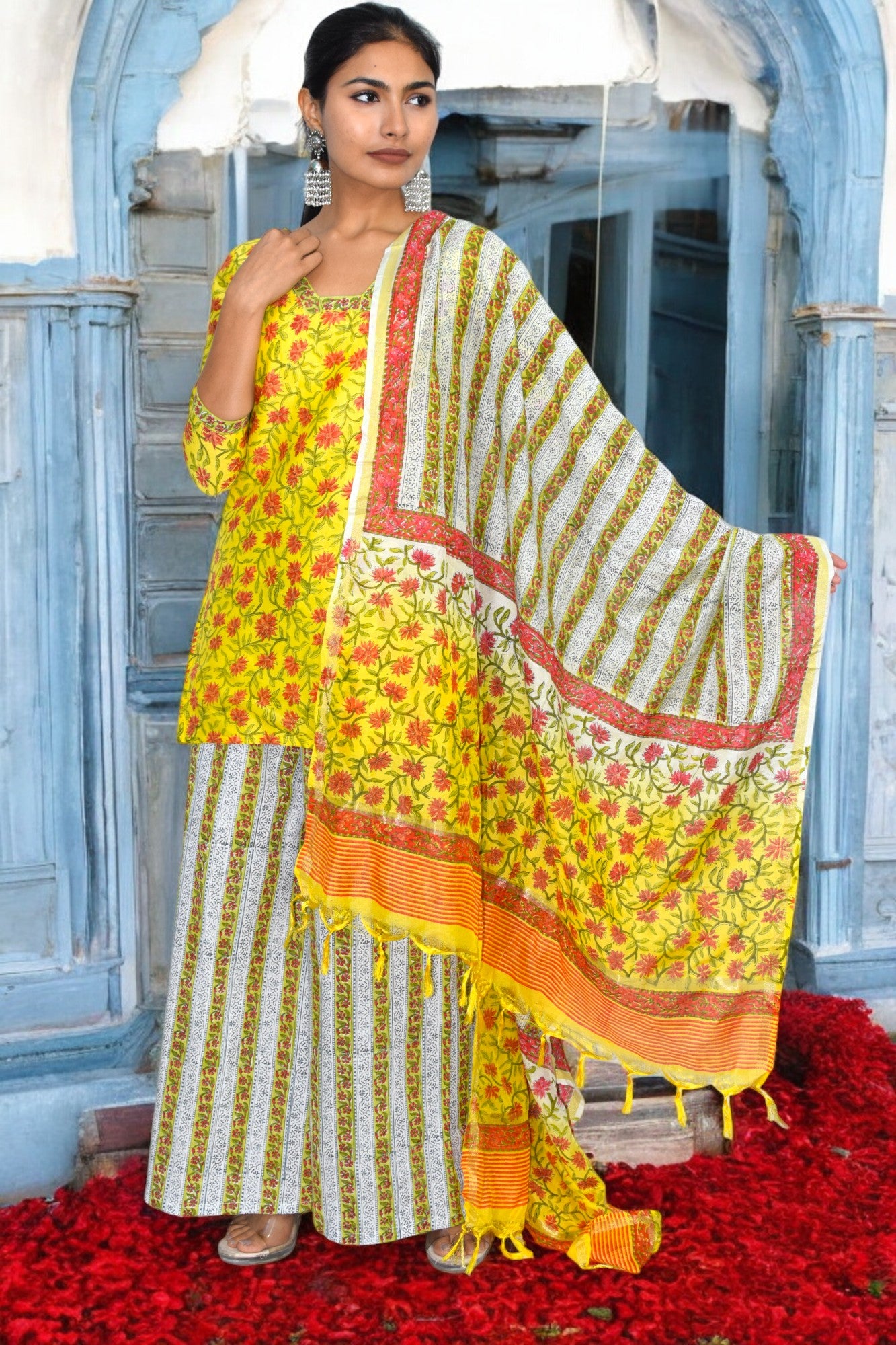 • Brighten up your ethnic wardrobe with this stunning Pure Chanderi Suit Set in vibrant yellow. Featuring a beautiful hand-block inspired floral print on the kurta, this outfit exudes traditional elegance with a modern touch. The kurta is paired with striped wide-leg palazzo pants for a chic silhouette, while the matching dupatta with floral and striped patterns adds the perfect finishing touch. Crafted in lightweight and breathable pure Chanderi fabric, this set is ideal for festive occasions, family gatherings, and celebrations.